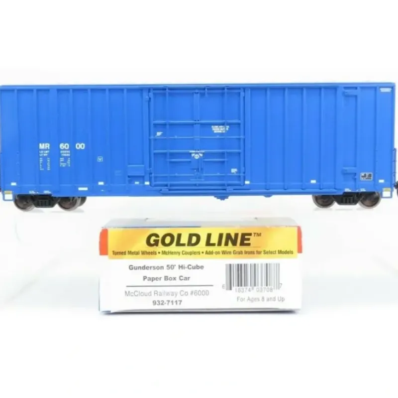 This is Walthers 7117 50′ HC paper box MCLD RV. Gold Line Gunderson 50′ high-cube paper-service boxcar, ready to run. McCloud River. Bigger is the key word to profitability for today’s railroads, and these extra-tall box cars help pay the bills on many lines. Designed to handle paper rolls 10′ or more in diameter (now used for magazine and newspaper production), these cars are a frequent sight alongside paper mills and printing plants as well as in passing trains.