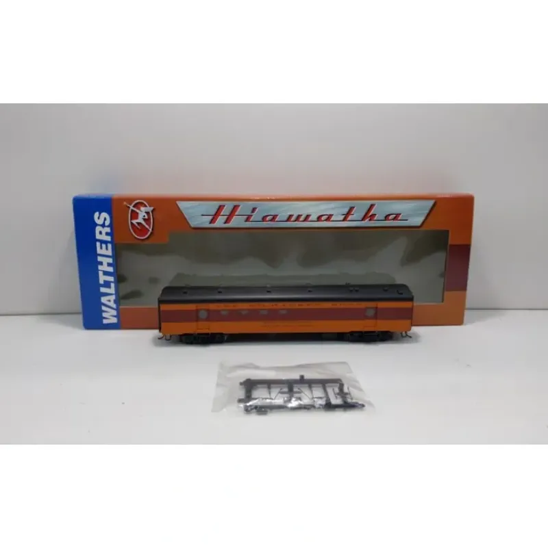 Here is a Walthers 9201Milwaukee Road Hiawatha RPO Car. Based on the 1955 Twin Cities Hiawatha this car features durable plastic construction with the correct 8′ wheelbase nystrom trucks, car name and number decals, die cast PROTO Max couplers, and RP-25 metal wheels. This passenger car is approximately 8.5 inches in length.