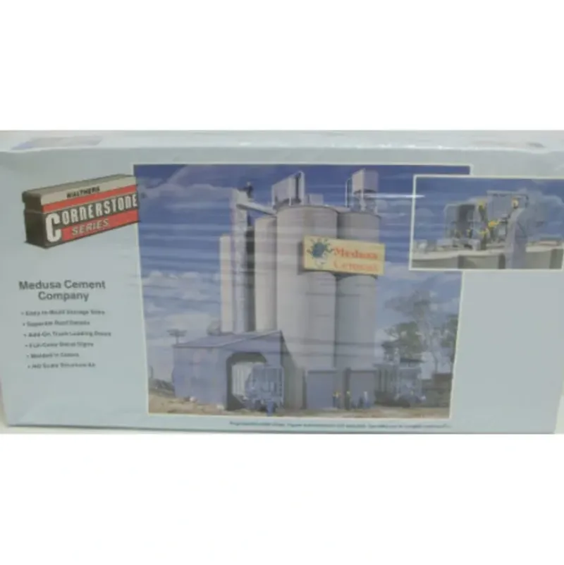 This is a Walthers 933-3019 HO Scale Medusa Cement Company Building Kit. Features include parts molded in color, easy-to-build storage silos, includes full color decal signs, add-on truck loading doors, separate roof details, and includes complete instructions. The completed model measures approximately 9 x 7-1/2.