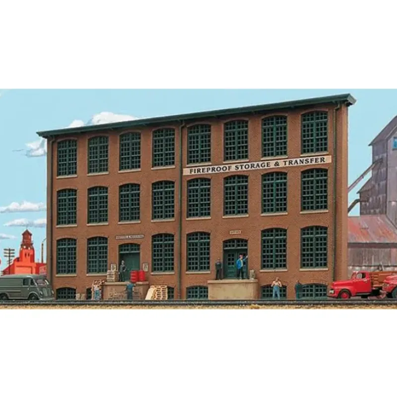 Perfect for the older part of your business district, the Walthers Cornerstone HO Scale Fireproof Storage and Transfer Background Building features period styling suitable for any steam- or diesel-era layout. The kit includes the large trackside wall of the building complete with two loading doors, plus two thin-depth end walls and roof. This versatile building makes a great warehouse, factory, distributor or other business. In the modern era, use it as an antique mall, upscale apartments or a museum. The Fireproof Storage and Transfer Background Building is one of many Cornerstone HO Scale industry kits. As shown Fireproof Storage and Transfer measures 10 x 2 25.4 x 5cm