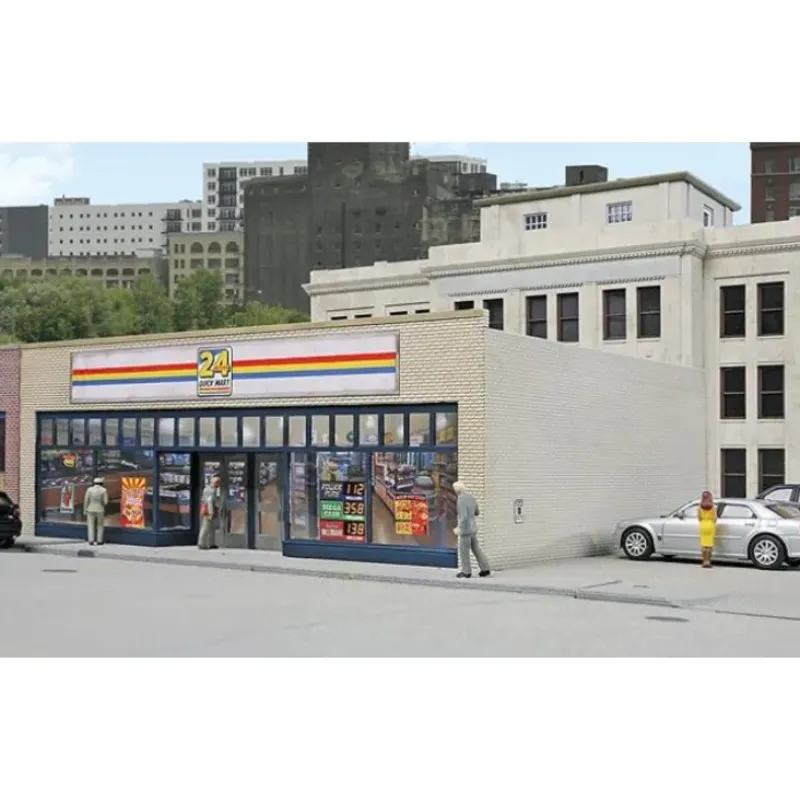 The Walthers Cornerstone 24-Seven Quick Mart is based on typical small, single-story businesses that were constructed in rapidly developing suburban neighborhoods in the postwar era. Featuring a brick structure with large display windows, this kit is typical of mini marts still used on Main Street or in suburban business districts. This easy-to-build plastic kit comes molded in appropriate base colors plus clear window glazing and includes a printed interior and printed signs. 24-Seven Quick Mart will be a welcome addition to any diesel- era layout. The finished structure measures: 7-1/8 x 5-3/8 x 2-5/8 18 x 13.6 x 6.6cm