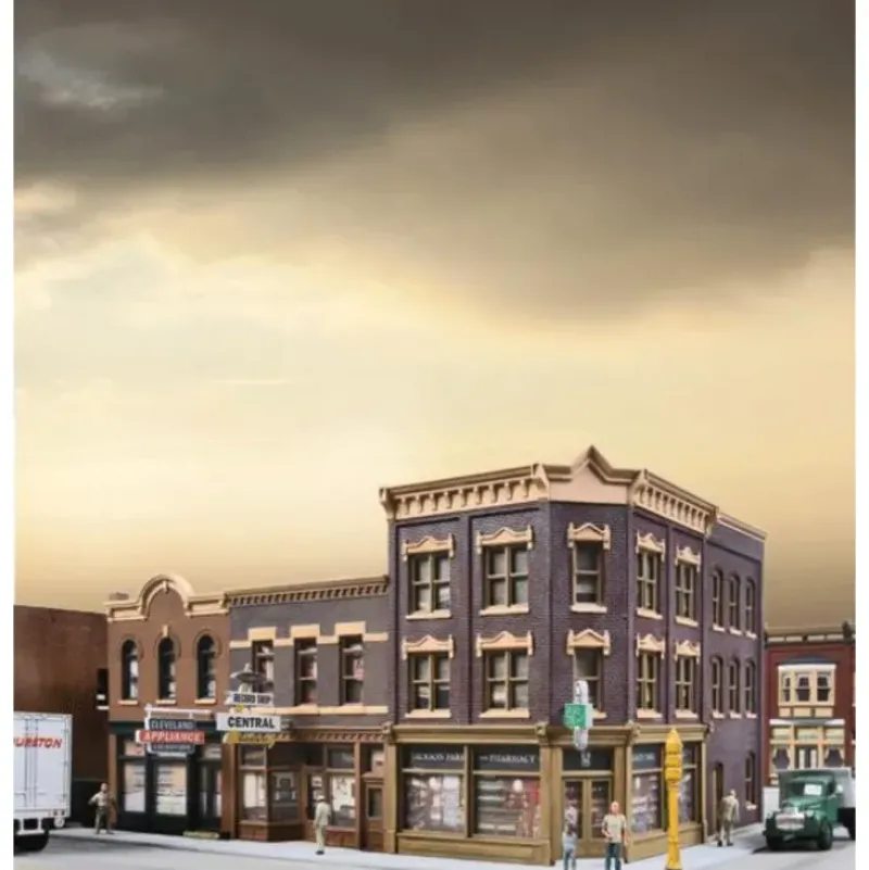 The Walthers Cornerstone Merchant’s Row V kit brings together three different stores in one easy-to-build structure. Featuring mixed two and three-story storefronts, this kit is designed for use on a right-hand street corner. It’s typical of commercial storefronts in use since the 1880s so it’ll look at home on your steam or diesel-era layout. This easy-to-build kit features original or modernized facade for the center shop and the kit includes a rear porch and stairway. Use it with other Cornerstone Merchant’s Row buildings to create a complete commercial district. Merchant’s Row V measures: 10-1/2 x 6-7/8 x 5-5/16 26.6 x 17.4 x 13.4cm