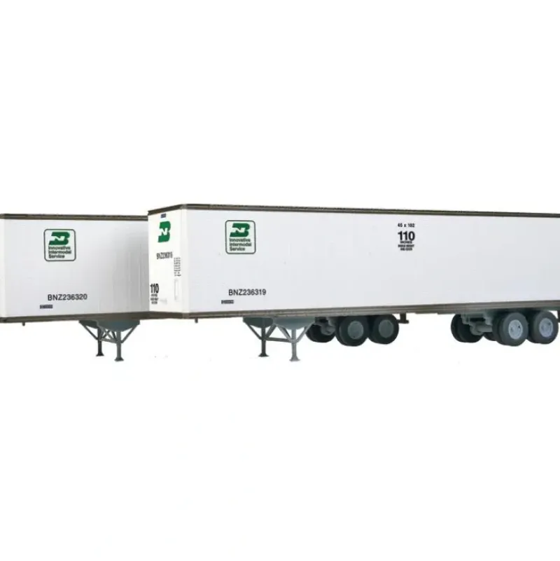 This is a Walthers 949-2203 HO Scale 45′ Stoughton Trailer 2-Pack – Assembled Burlington Northern * Limited Edition — One Time Run of These Roadnumbers! * Fully Assembled, Ready to Use * In Service 1980s – Present * Fits Most Intermodal Flatcars * 2 Trailers w/Different Numbers * New Underbody & Wheel Decoration for Improved Realism * Perfect for Detailing Cars, Yards, Loading Docks, Highways & Terminals