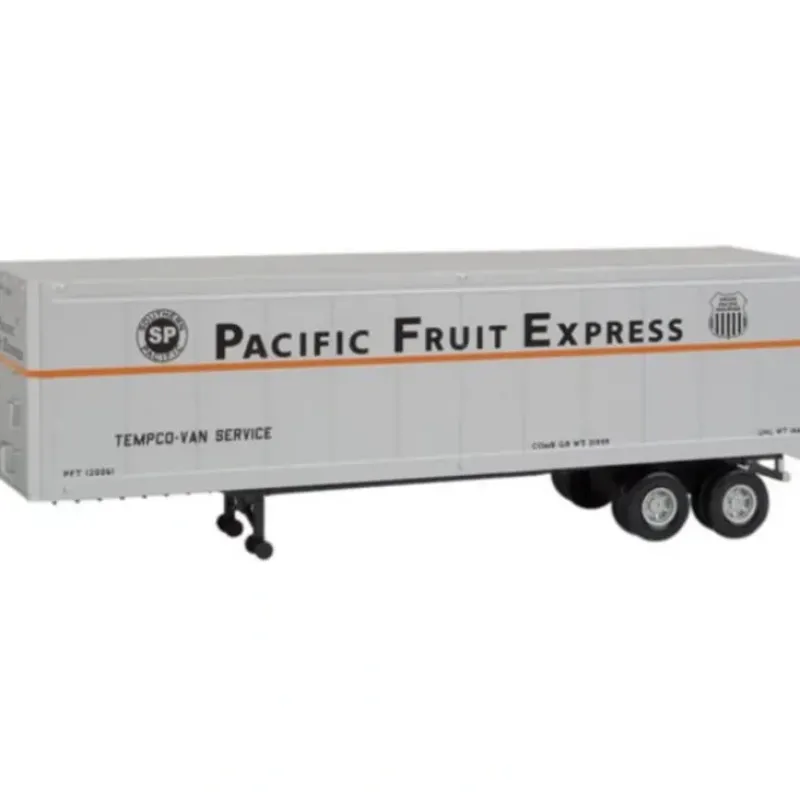This is a Walthers 949-2320 HO Pacific Fruit Express – 40′ Trailer 2-Pack. Easy way to Model 1960s & 70s Intermodal Traffic, Load & Detail Piggyback Flats, Highways & Truck Docks, Prepainted in Authentic Period Schemes, and Ready to use. With changes in weight and length regulations, trucking companies quickly moved up to 40′ trailers in the 1960s. Railroads were obliged to follow suit and began introducing larger cars, like the F89F, capable of carrying two of these trailers. These models are prepainted in authentic schemes and come fully assembled.