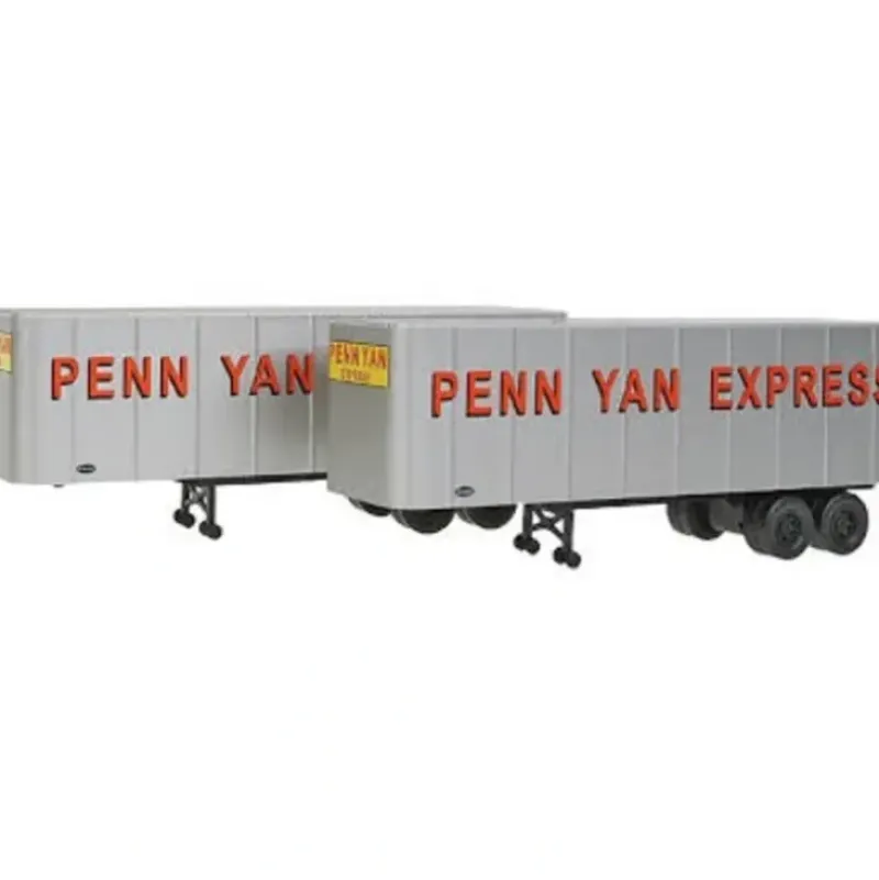 This is a Walthers 949-2351 HO scale 32′ Trailer 2-Pack – Assembled Penn Yan Express (silver, red, Large Lettering) * Must-have for Ealry Piggyback Srvice * Standard US Trailer in 1940s and 1950s * Detail Period Highways & Loading Docks * Colorful, Authentic Schemes In the 1950s, piggyback service was used for LCL shipments traveling a short distance. These trailers are perfect for loading earlier 40 and 50′ flats converted for Trailer on Flatcar and Piggiyback service, and are prepainted in authentic schemes.
